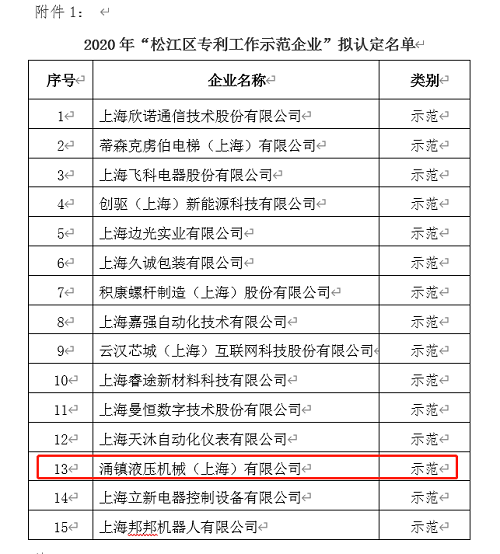 2020年涌鎮(zhèn)液壓成功入選“松江區(qū)專利示范企業(yè)”行列,并獲得立項。